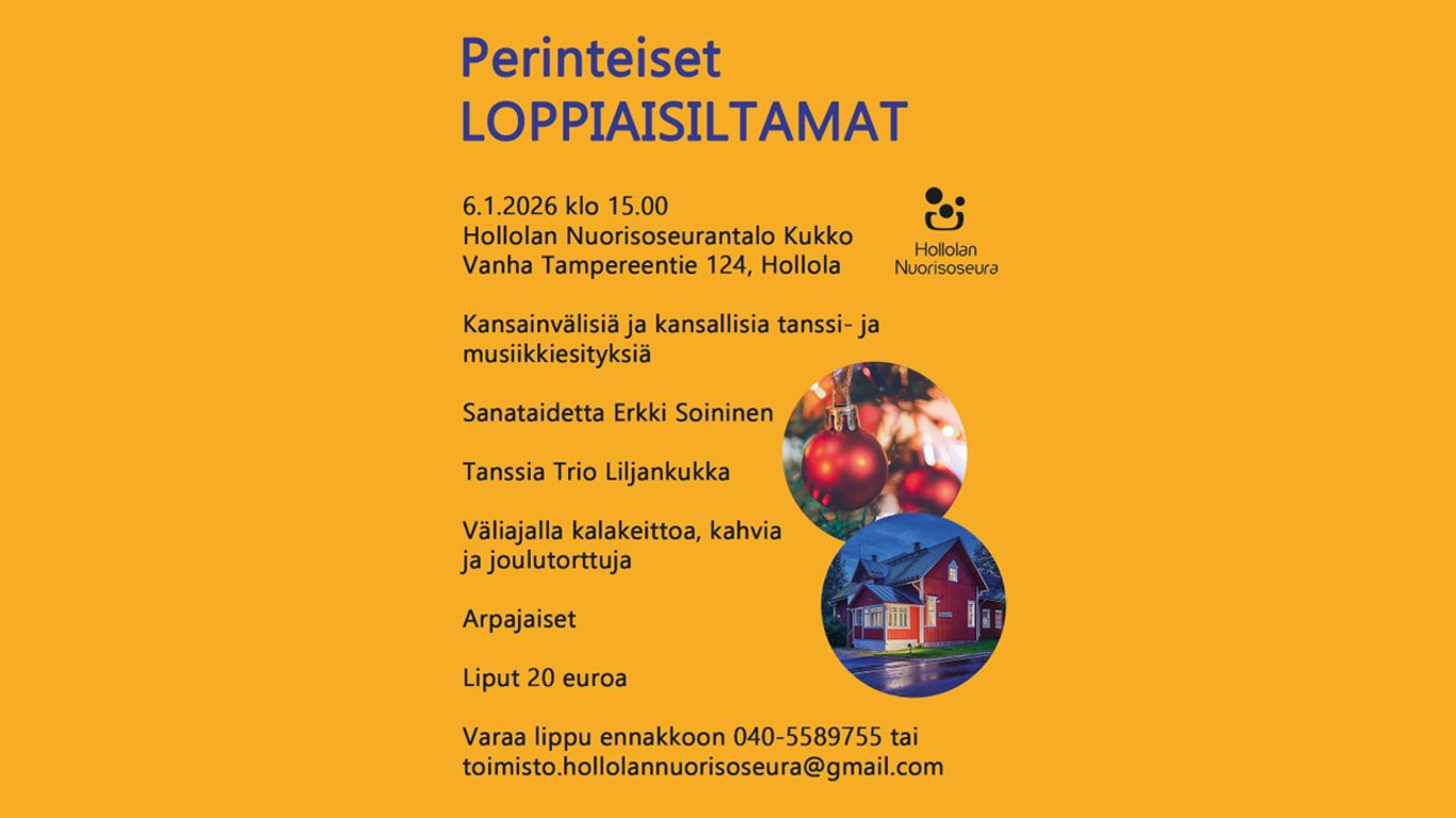 Perinteiset Loppiaisiltamat Hollolan Nuorisoseurantalo Kukossa. Luvassa tanssi- ja musiikkiesiyksiä paikallisilta ryhmiltä sekä Latviasta ja Unkarista.