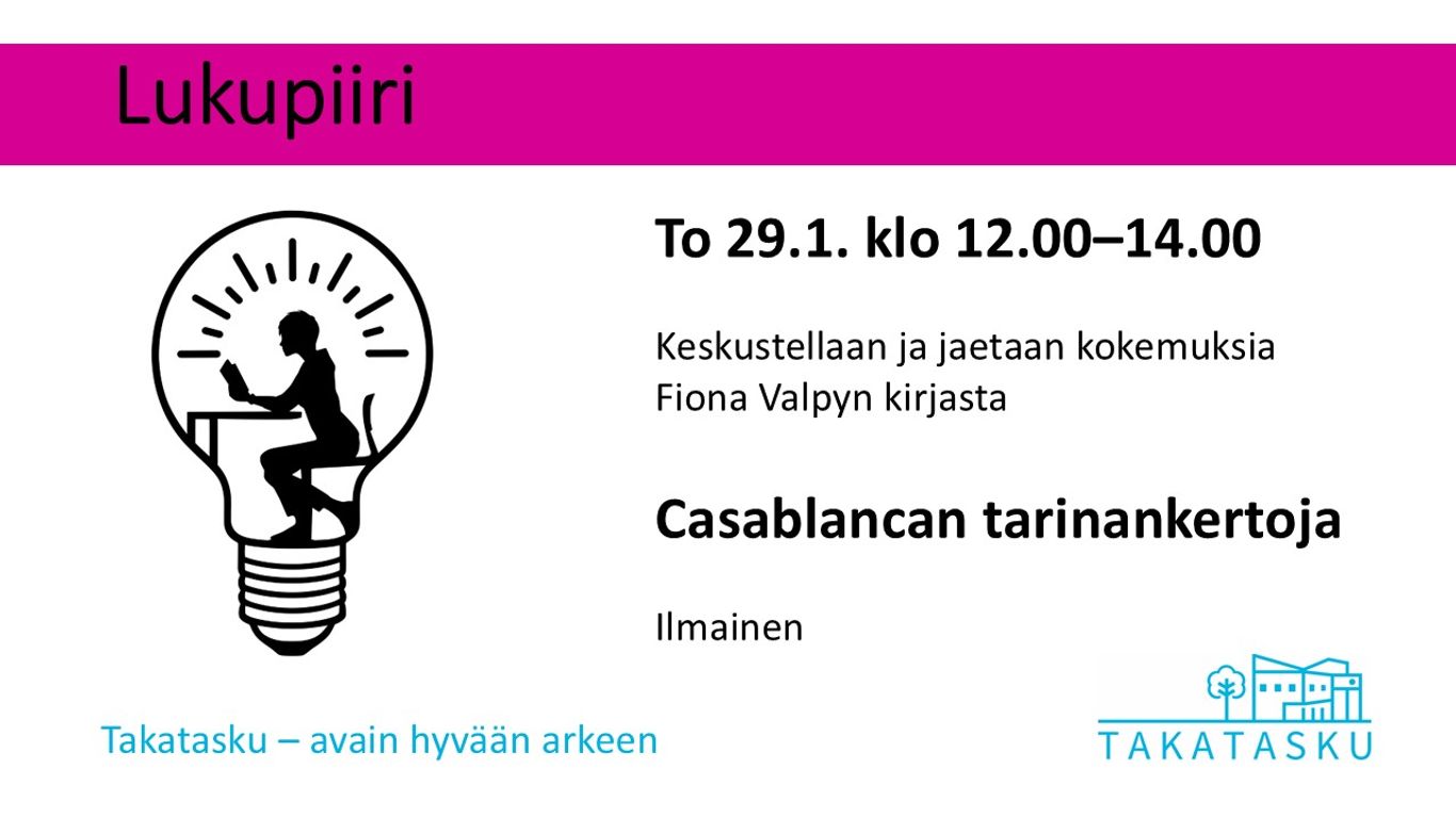 Perehdytään kirjallisuuteen perinteisen lukupiirin tavoin. Valitaan yhdessä kirjat, joista keskustellaan ja jaetaan kokemuksia. Tammikuun kirja on Fiona Valpy: Casablancan tarinankertoja.