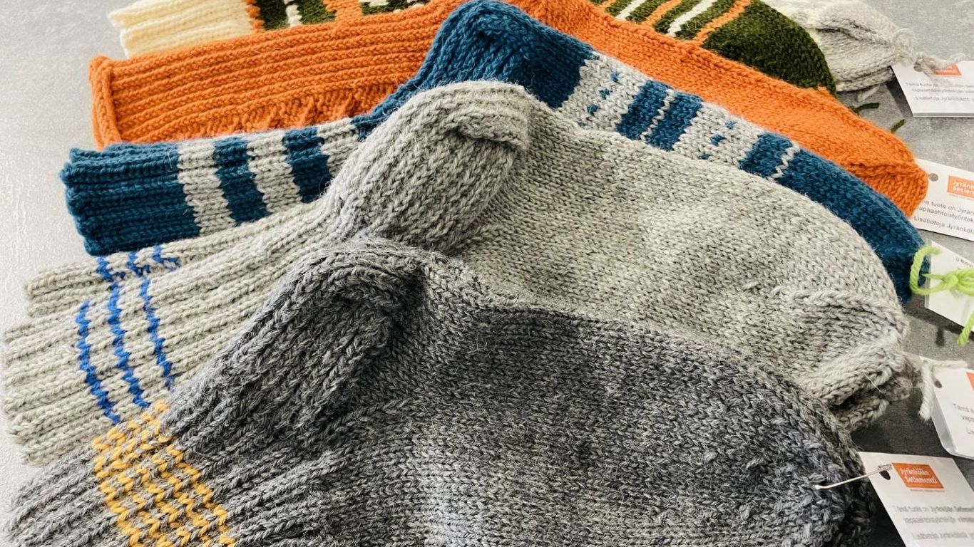 Myynnissä Jyränkölän Setlementin vapaaehtoisten kutomia villasukkia, lapasia ym. käsitöitä. Myyjäisten tuotto Jyränkölän Setlementin vapaaehtoistyön hyväksi.
