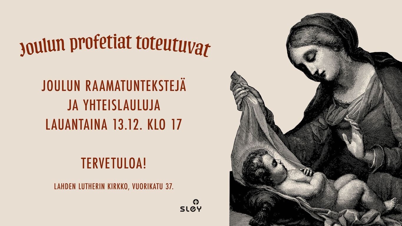 Tule kuulemaan joulunajan raamatuntekstejä ja laulamaan yhdessä hengellisiä joululauluja. Lopuksi tarjolla joulupuuro.
