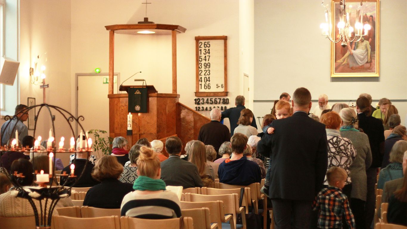Liturgia ja saarna Sleyn toiminnanjohtaja Tom Säilä. Pyhäkoulu lapsille saarnan aikana. Kirkkokahvit messun jälkeen.