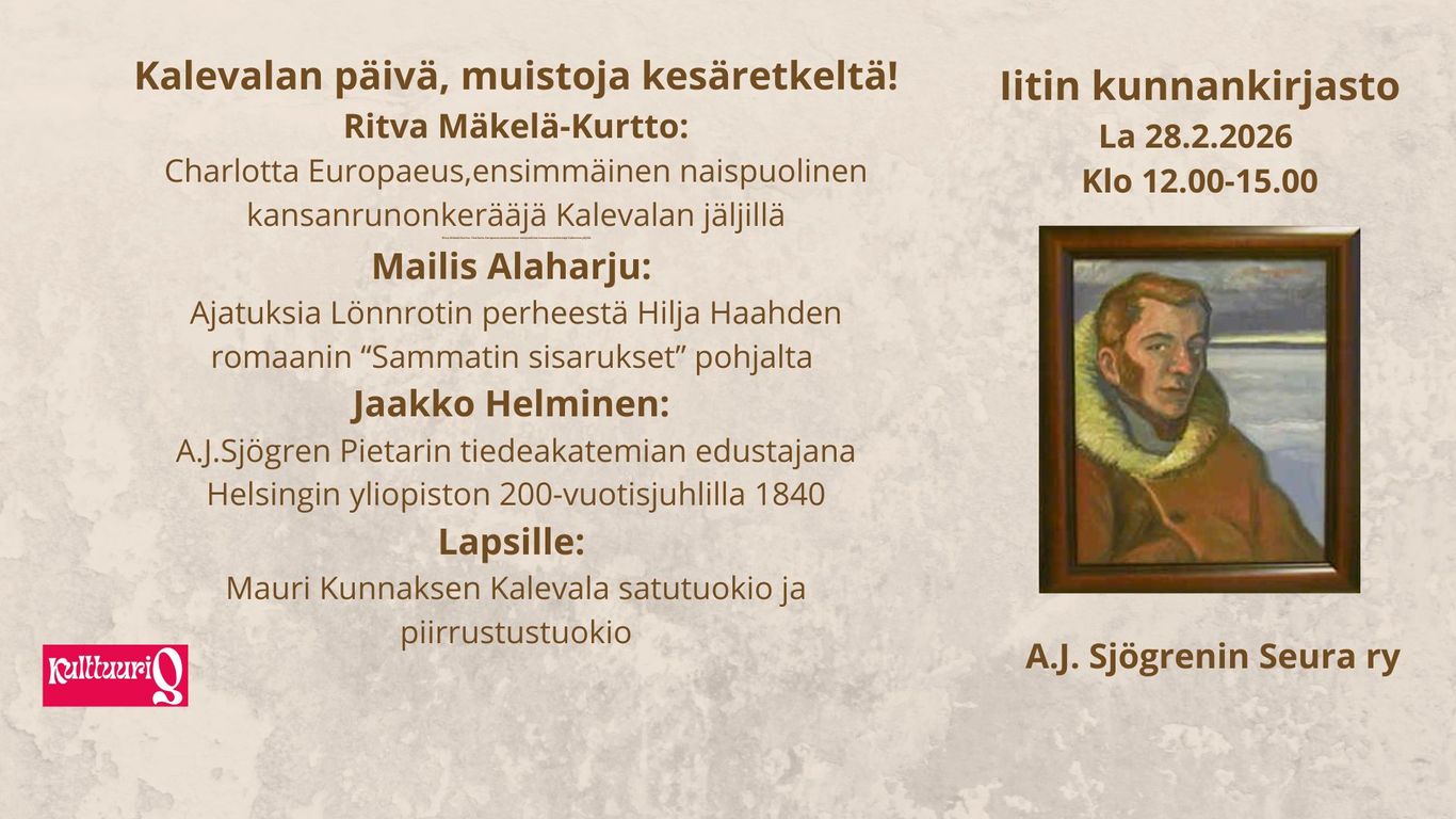 A.J. Sjögren seuran Kalevala päivän muistoja, ajatuksia Lönnrotin perheestä, satutuokio ja piirrustustuokio.