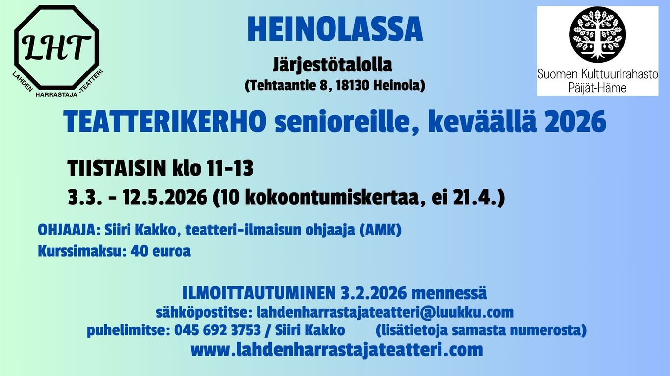Tule tutustumaan matalalla kynnyksellä monipuolisesti näyttelemiseen senioreiden teatterikerhoon, joka kokoontuu 10 kertaa tiistaisin klo 11-13 Heinolan Järjestötalolla 3.3.-12.5.2026.