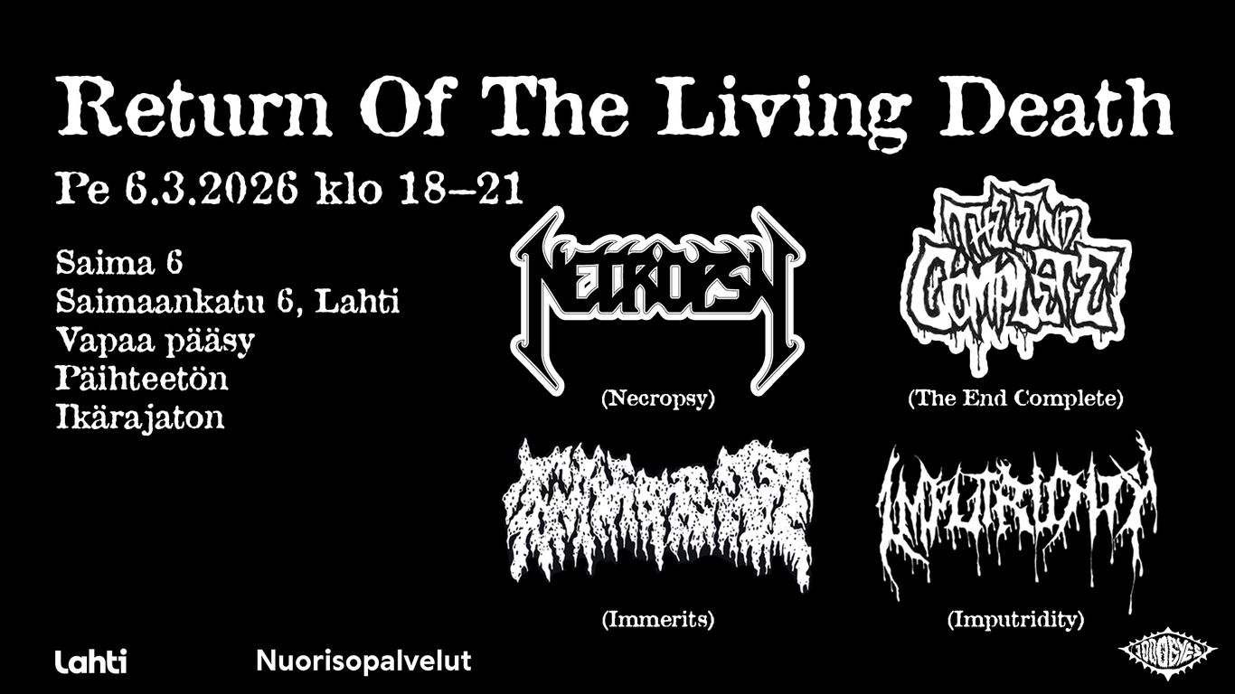 Tapahtumassa esiintyvät Necropsy, The End Complete, Imputridity ja Immerits. Vapaa pääsy. Päihteetön. Ikärajaton.