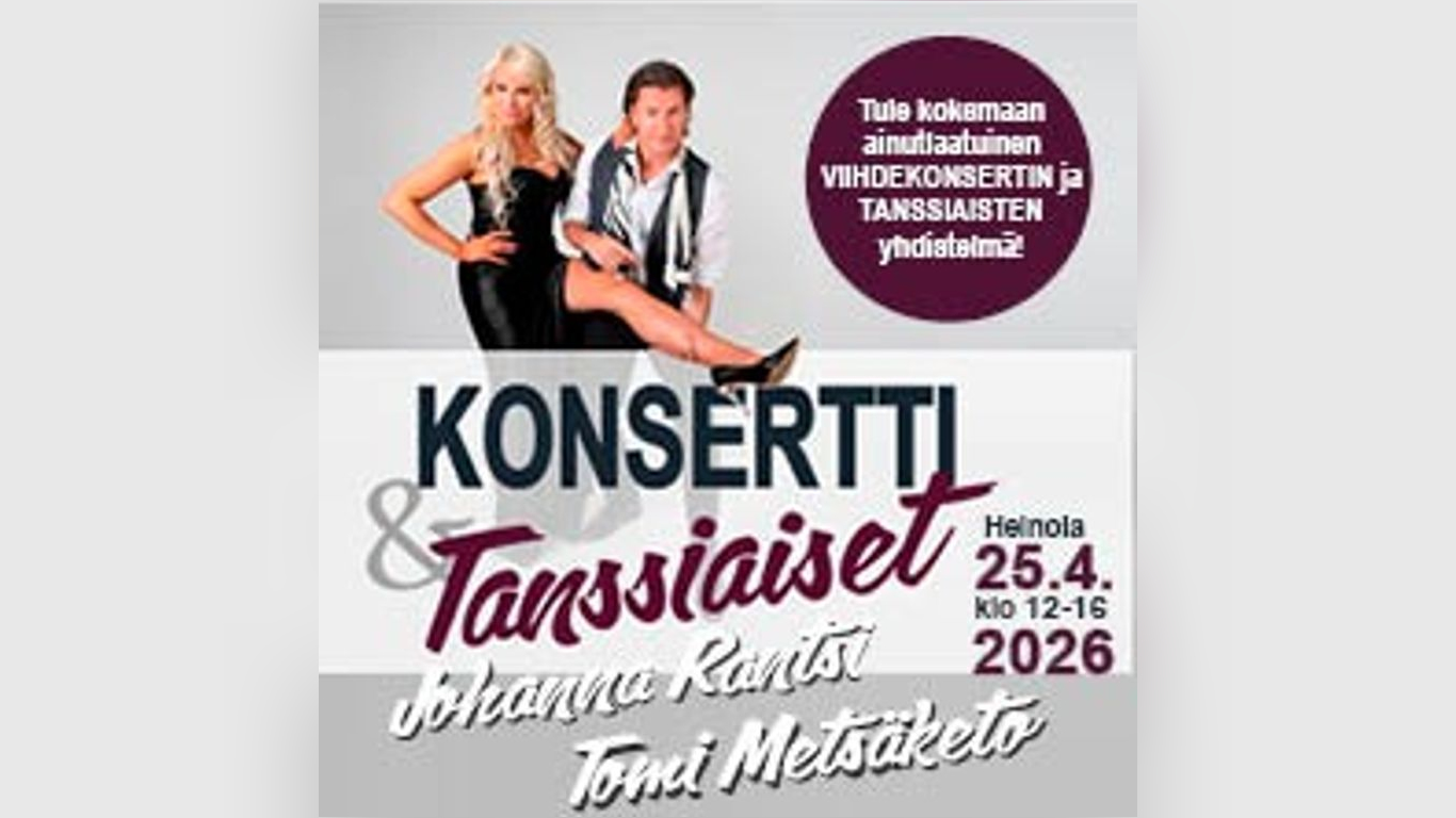 Konsertti & Tanssiaiset la 25.4.2026 klo 13 -16 Heinolan Lukio, Lampikatu 1 Heinola. Johanna Rantsi & Tomi Metsäketo Show Ovet ja kahvio avautuvat…