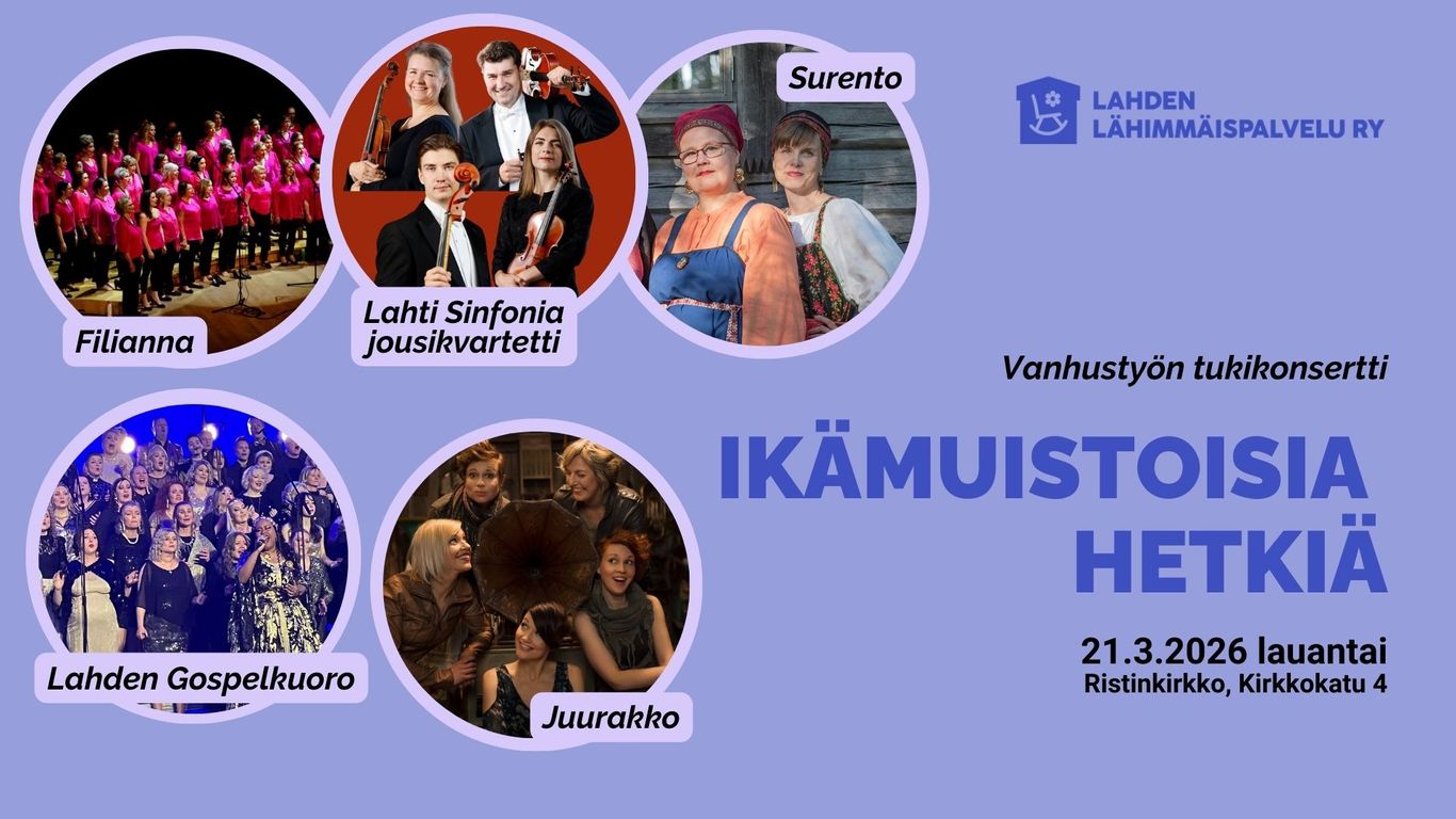 Ikämuistoisia hetkiä -tukikonsertti. Lahden Ristinkirkossa esiintyy viisi upeaa kokoonpanoa vanhustyön puolesta.