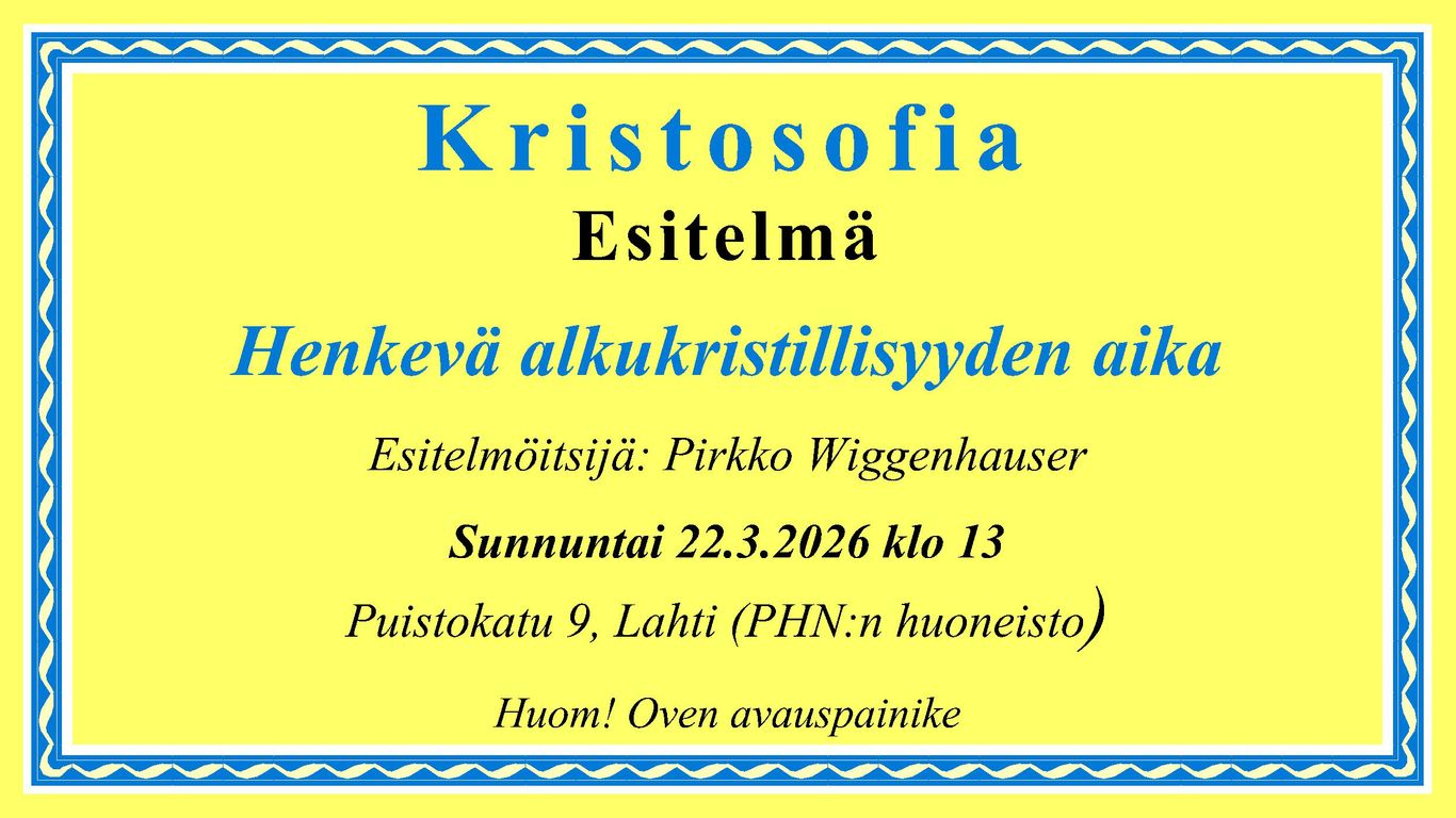 Esitelmän aihe: Henkevä alkukristillisyyden aika Esitelmöitsijä: Pirkko Wiggenhauser